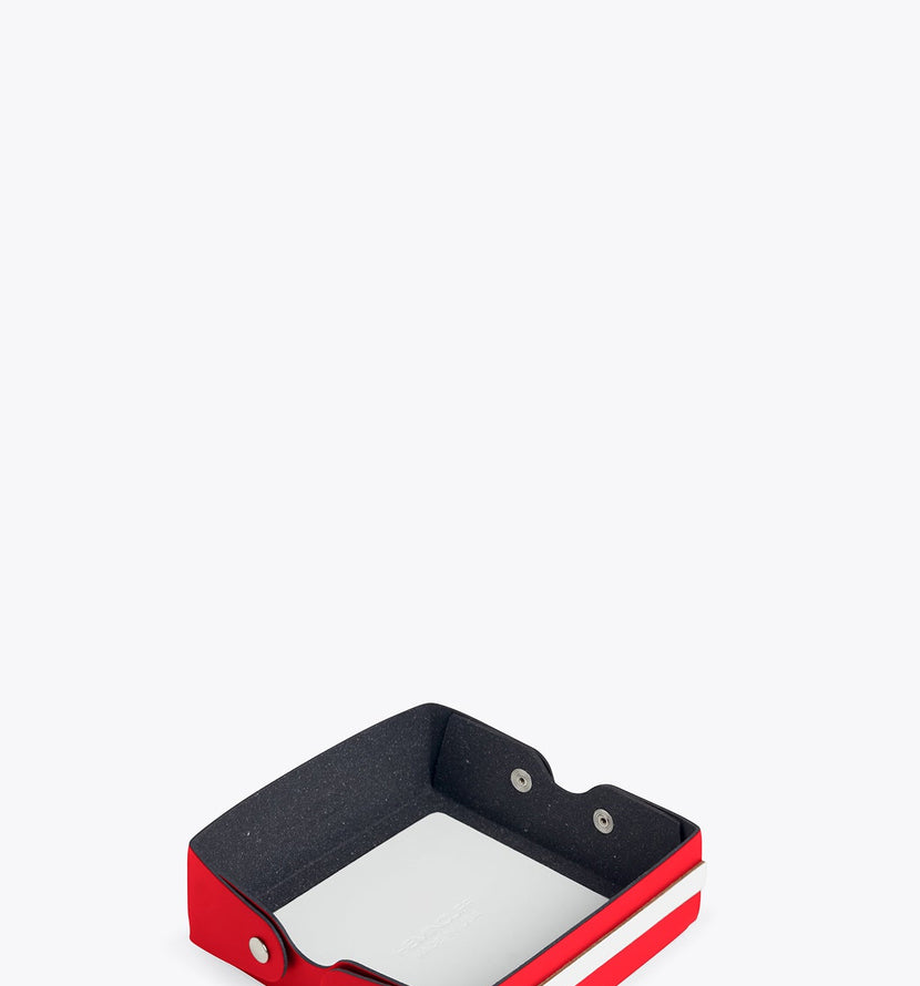 CATCHALL TRAY FEATURING A DEBOSSED LOGO INLAY AND SILVER METAL SNAP HARDWARE. HANDCRAFTED WITH RECYCLED VEGAN MATERIAL, THIS TRAY IS MADE USING AN ORIGAMI FOLDING TECHNIQUE THAT DOES NOT UTILIZE ANY STITCHING. MORE DETAILS DIMENSIONS: 5 x 5 INCHES / 12.7 x 12.7 CM MADE IN USA
