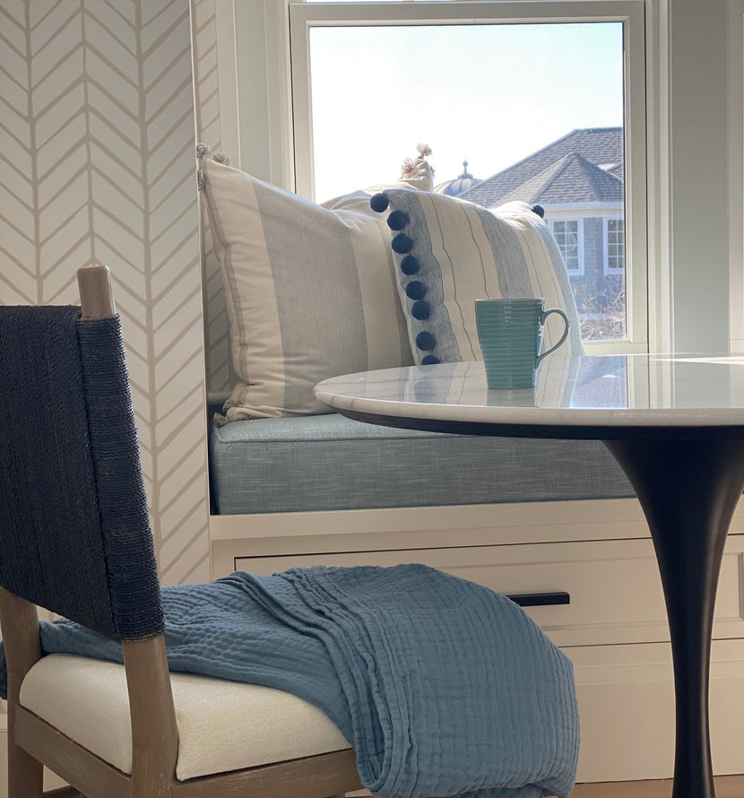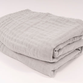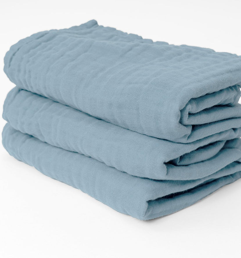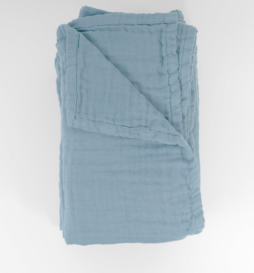 This is a truly "whisper weight" version of our original 8 layer blanket. It will feel more like a flannel sheet, but soooo much more breathable. As a throw it is perfect on the couch with its unique texture and buttery feel. On the bed, it is meant to be used as a flat sheet, as a layering blanket, or as a quilt in hot climates with the windows open. Why? You can't find a softer gauze material. It took us over a year just to settle on this fabric. How? Grown organically without pesticides or harmful chemicals on any step of the process. The Feel Good? Knowing that your buttery soft blanket is made entirely of healthy GOTS certified organic muslin and organic dye that benefits your body and the planet. Designed in Boston and made in India with respect for the earth, for all of the people who work on the supply chain and for you and your family. Thickness: 4 layers of woven GOTS certified organic gauze Size: 82"x64" after washing Color: Lake