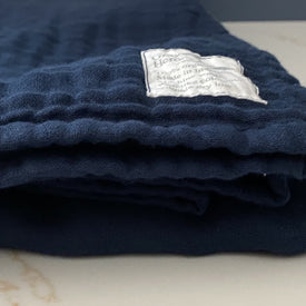 This is a truly "whisper weight" version of our original 8 layer blanket. It will feel more like a flannel sheet, but soooo much more breathable. As a throw it is perfect on the couch with its unique texture and buttery feel. On the bed, it is meant to be used as a flat sheet, as a layering blanket, or as a quilt in hot climates with the windows open. Why? You can't find a softer gauze material. It took us over a year just to settle on this fabric. How? Grown organically without pesticides or harmful chemicals on any step of the process. The Feel Good? Knowing that your buttery soft blanket is made entirely of healthy GOTS certified organic muslin and organic dye that benefits your body and the planet. Designed in Boston and made in India with respect for the earth, for all of the people who work on the supply chain and for you and your family. Thickness: 4 layers of woven GOTS certified organic gauze Size: 82"x64 after washing Color: Navy