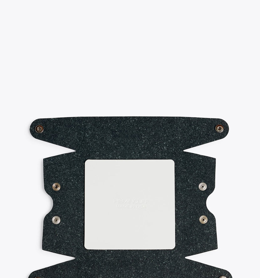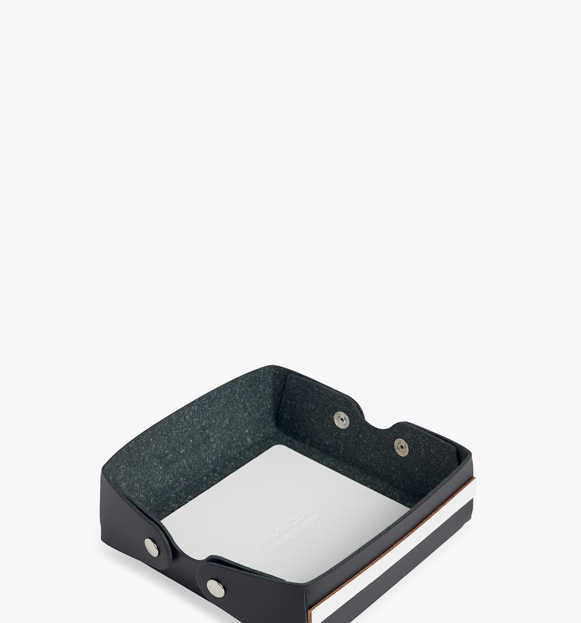 CATCHALL TRAY FEATURING A DEBOSSED LOGO INLAY AND SILVER METAL SNAP HARDWARE. HANDCRAFTED WITH RECYCLED VEGAN MATERIAL, THIS TRAY IS MADE USING AN ORIGAMI FOLDING TECHNIQUE THAT DOES NOT UTILIZE ANY STITCHING. MORE DETAILS DIMENSIONS: 5 x 5 INCHES / 12.7 x 12.7 CM MADE IN USA