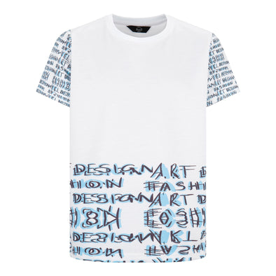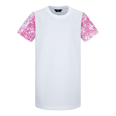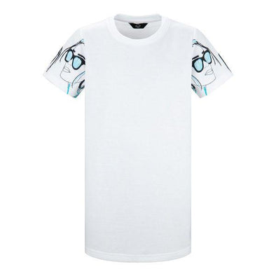 GIRLS WHITE REGULAR FIT T-SHIRT DRESS WITH BLUE FACEPRINT ARM DETAIL