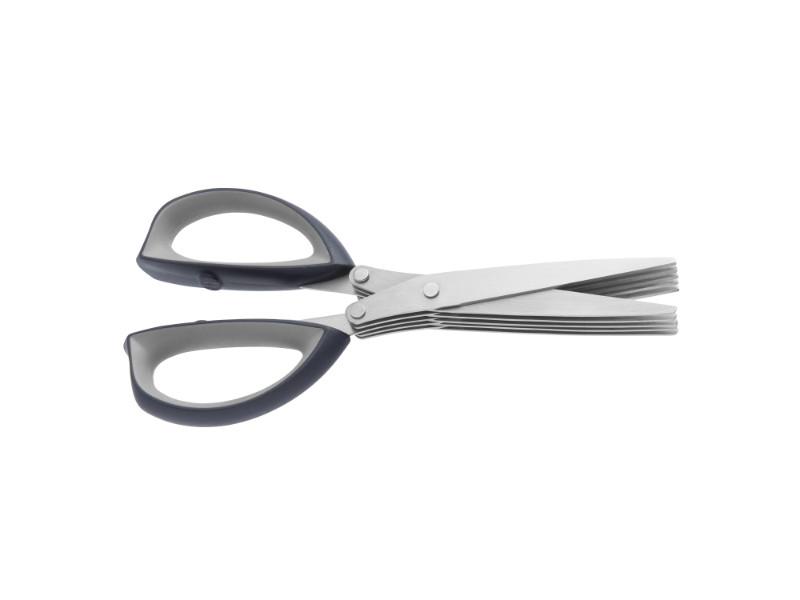 Snipping, cutting and chopping fresh herbs has never been easier than with these multi-blade scissors. The 5 stainless steel blades on each side make uniform-sized pieces that look neat and cook evenly while the non-slip handles ensure a secure grip for extra safety. The brush that comes with the scissors cleans the blades efficiently and can also be used as a useful tool to gather up the chopped herbs. Material scissors: Stainless steel 5 blades, dark grey PP and light grey TPR handle. Material brush: PP. Size: 8" blade, 3x 1" cleaning brush. Stainless steel Kitchen Shears with ergonomic PP soft-grip handle. Satin finish. Multi-blade that makes kitchen prep work hassle-free, cutting herbs quickly and evenly. Well-balanced with a heavy bolster for increased control. Ergonomic handle allows for precise cuts. Perfect for chopping or mincing herbs for garnish or seasoning. Built to withstand heavy use with a fast, simple cleanup. Hand wash recommended