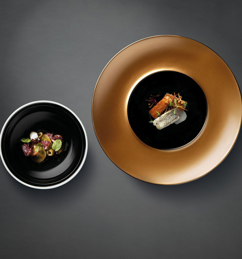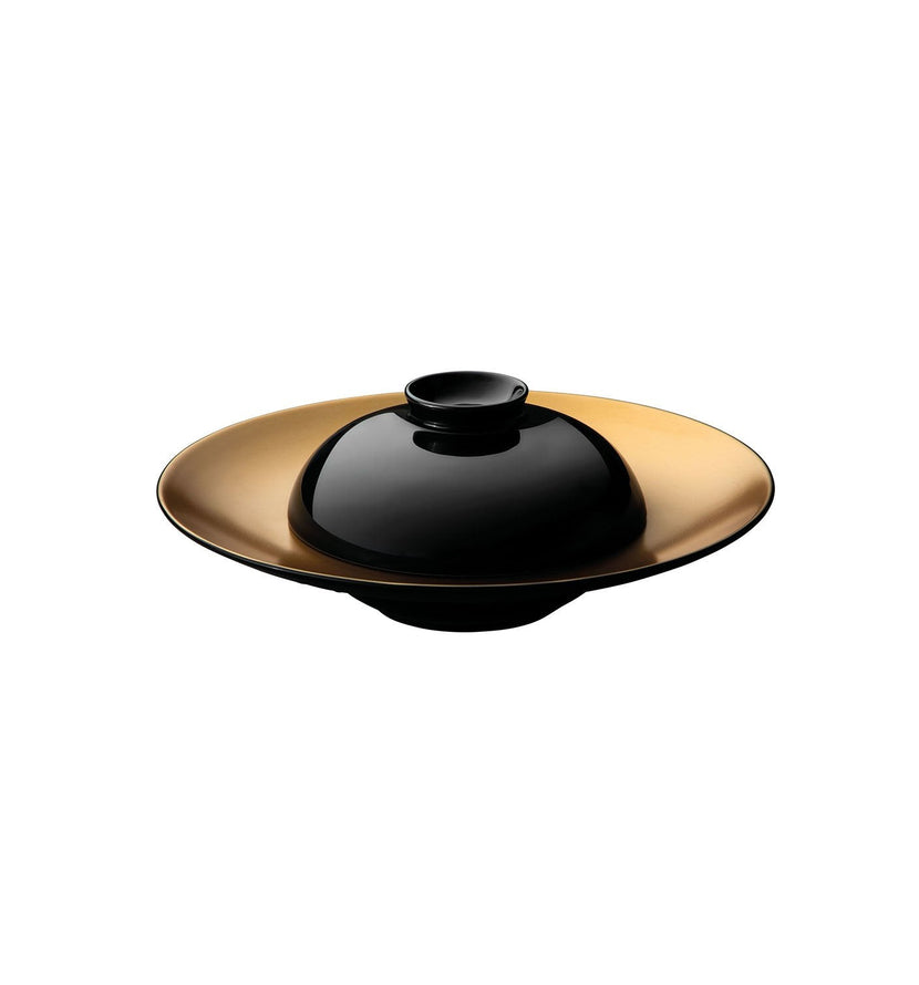 Featuring this deep presentation plate with golden rim, the elegant way to serve. The high-quality porcelain with glossy finish instantly adds a touch of glamour to meals and is dishwasher safe, for a fast & easy cleanup. The matching bowl can either be used as a cover to add an element of surprise or as a separate item to serve a side dish. Package includes: Porcelain Deep plate 2", and Bowl 2.25", Black & Gold Made of Porcelain with elegant glossy finish Bowl and plate, although elegant together, may be separated to serve different dishes. Versatile plates that make for a fantastic house-warming gift. Bring this set out for those big family festivities! This high-quality vitrified porcelain is high-fired to ensure chip and stain resistance. Strong enough to withstand heavy use with a fast, simple cleanup. Dishwasher safe.
