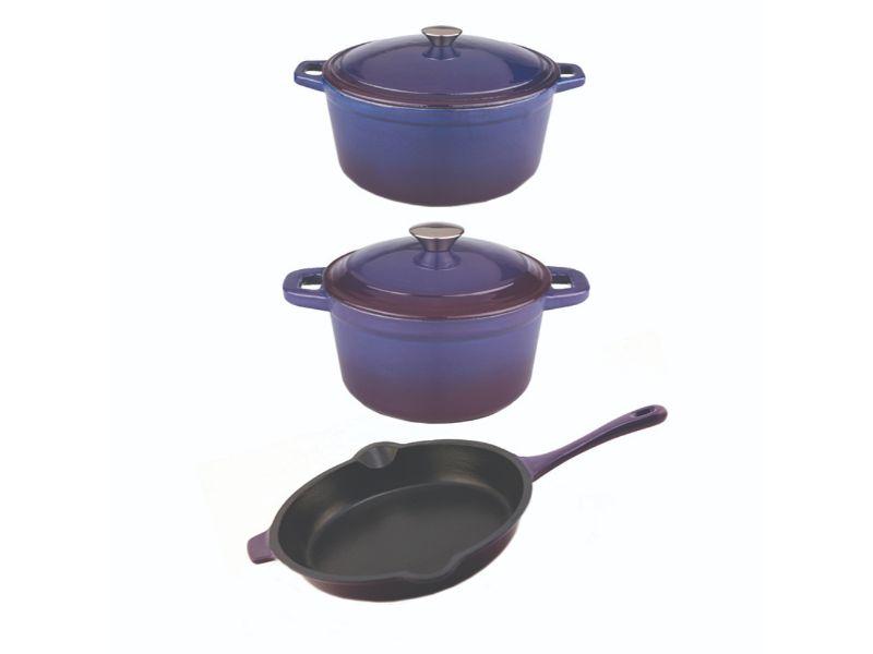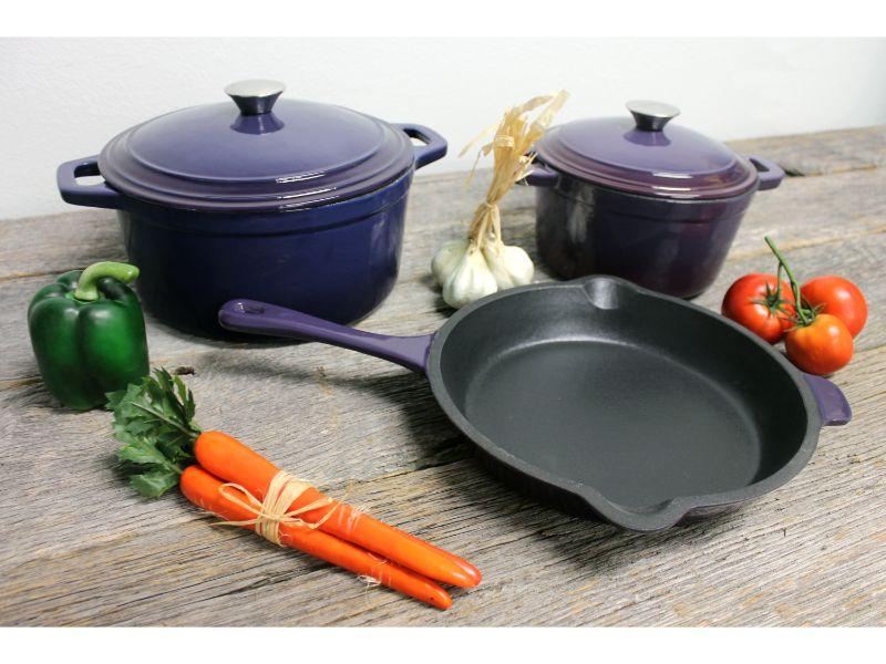 Neo 5pc Dutch Oven set with 10" Fry Pan is built for enduring performance. Constructed from robust cast iron with a sleek enameled coating, it ensures even heating and superior heat retention. The versatile Dutch oven is ideal for both stovetop browning and oven roasting, while the stock pot is perfect for braising, making stews, chili, and more. The included tight-fitting vapor seal lid is specially crafted without a vent, ensuring the retention of nutrients, vitamins, moisture and taste in your dishes. The fry pan features an integrated pour spout and a helper handle for convenient draining and transferring. Compatible with all cooktops such as gas, electric, ceramic, glass, and induction cooktops and oven-safe up to 535°F. Set includes: 8" Round Dutch Oven 3qt, 10" Fry Pan, 11.5" Oval Dutch Oven 5qt, 2x Lids. Available in 9 colors: Blue, Green, Meringue, Orange, Oyster, Pink, Purple, Red, White Package includes: 8" Round Dutch Oven 3qt, 10" Fry Pan, 11.5" Oval Dutch Oven 5qt, 2x Lids. Upgrade your kitchen essentials with our eco-friendly dutch oven set, made of durable and high quality cast iron featuring a glossy base with enamel coating and wide, ergonomic handles for a safe and secure grip. Includes matching vapor seal lids. No need for preseasoning thanks to the enamel coating. The coating provides a smooth, nonporous, non-absorbent surface for easy cleaning. The fry pan features a helper handle with two pour spouts on the side for a secure and comfortable grip when transferring from stovetop to oven to table. Drain excess fats or liquids with ease. The tight-fitting vapor seal lid is specially crafted without a vent, ensuring the retention of nutrients, vitamins, moisture and taste in your dishes. The condensation bumps under the lid are designed to circulate steam, creating a self-basting effect which eliminates the need for excess water and promotes more nutritious, healthy meals. Achieve perfect results every time with cast iron material. A cast iron construction is made for exceptional heat retention to and even heat distribution to enhance flavor and texture. your meals stay hot from stovetop to oven to table. Designed to be compatible with a wide range of cooktops such as Induction, Electric, Gas, Halogen, Vitro-ceramic Stoves. Oven safe up to 535°F. Preserve the pristine condition of your dutch ovens by following these cleaning tips: allow it to cool before washing, use a sponge or nylon scrubbing pad to remove food residue and stains, wash with warm water and mild soap and avoid abrasive materials or harsh detergents. Hand wash only.