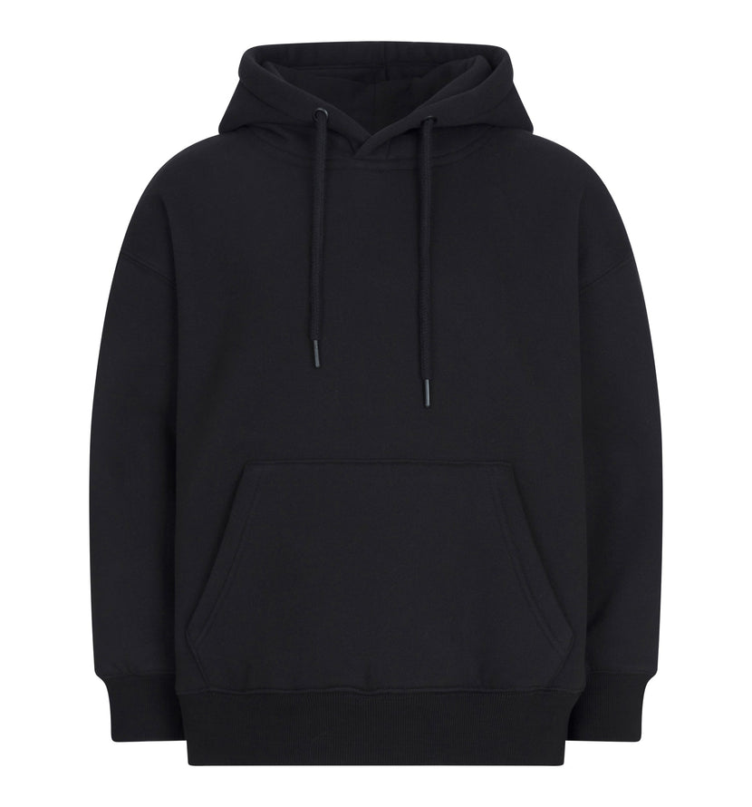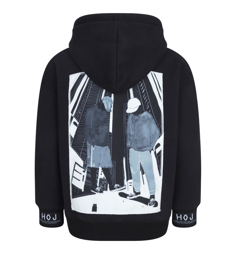 Luxury Urban styled black hooded jumper with illustrated graphic canvas detail across the back panel with delicate detailed HOJ embroidery across the jumpers cuffs