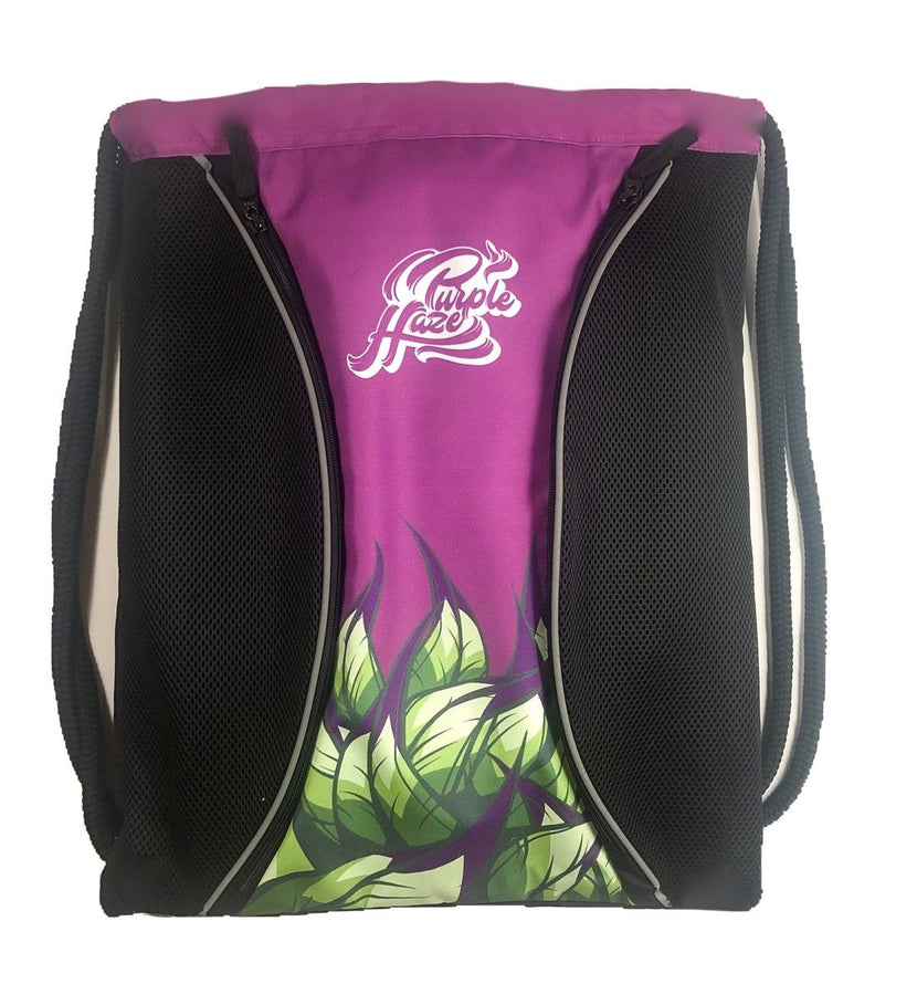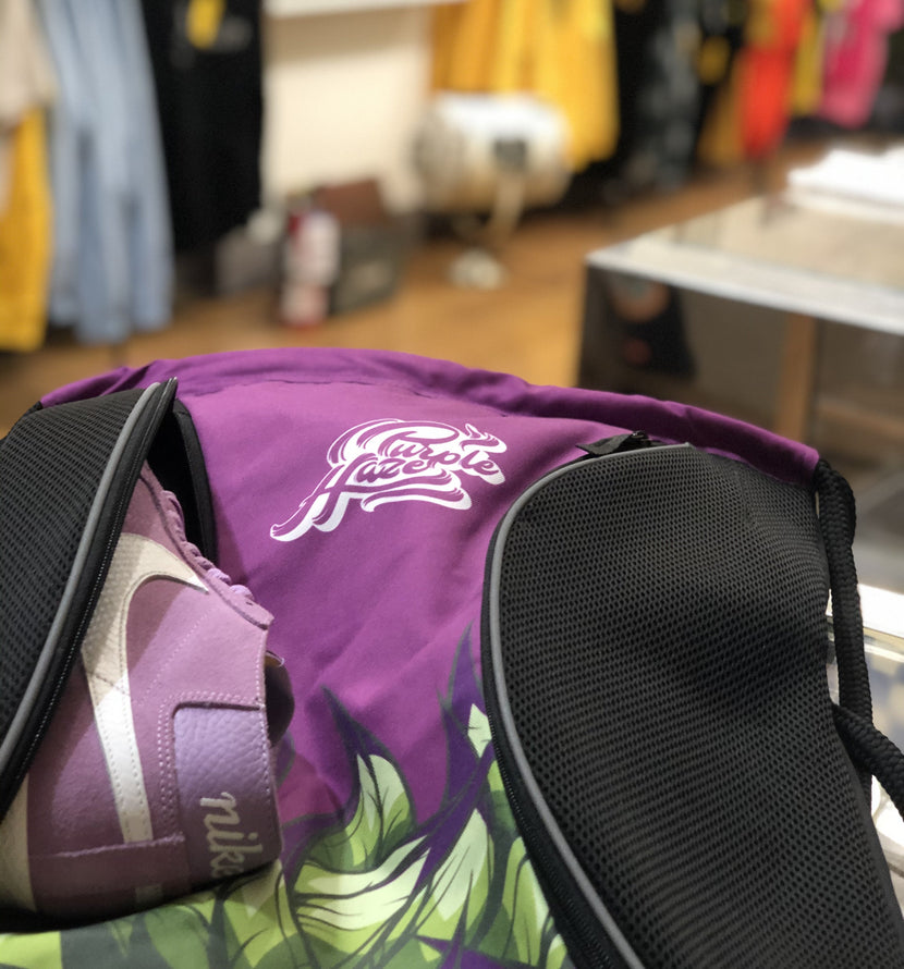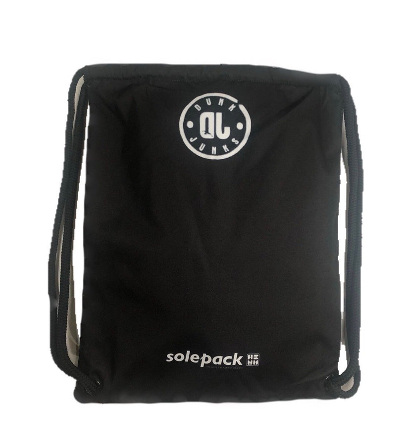 A unique collaboration with GERMAN based brand Dunk Junks. Our GRF+ sneaker bag takes on a colorful purple with green leaves along the bottom- giving a nod to the culture. The back of the bag displays both brand's logos. *Bag can be worn front/backwards depending on what print you are feeling for the day. Reflective piping lines the front to add a little shine at night. Get yours while they last!!! Dunk Junks is a colorful skateboarding brand heavily influenced by the NikeSB DUNKS! At Solepack, we've always been influenced by the skate and other subcultures that shaped us during the 90's in NYC. It was a perfect blend bringing this project to life. For more on Dunk Junks, click below: https://dunkjunks.com/ (The GRF elevates the game for the classic drawstring bag. Its design strategically stores shoes and separates them from the bag's main interior compartment: the Solepack signature of how to travel with your shoes. The GRF is the perfect bag for quick trips to the courts, gym, or any other light packing excursion.) Details: Fits up to a size 13-14 men's shoe Dimensions: 19.5" x 16" Materials: Heavy Duty Poly Zippers: YKK Reflective Piping