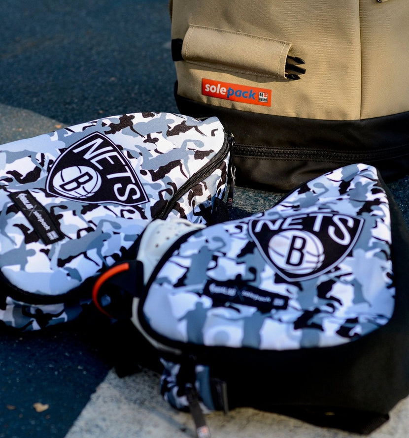 BROOKLYN NETS. NBALAB x SOLEPACK SP-1. Pack with Love, it's the Brooklyn way! B-R-O-O-O-O-K-L-Y-NNNNN!! This special edition Brooklyn Nets NBALAB x SOLEPACK SP-1 shoe carrier takes packing kicks to the next level- representing your favorite team like never before!A collaborative player camo piece with the NBALAB and contemporary street artist, Billi Kid, graces the cover of our bags. Pack sneakers onto any backpack or our OMEGA pack and rep your team every time you hit the gym, courts or fly around the world. This collaboration celebrates the original concepts and cultures that has inspired the Solepack journey. Read more about the collab HERE !!! Available in L & XL ONLY [The SP-1 is an innovative backpack accessory for storing your kicks during travel. The dual compartments are made of a heavy duty ballistic poly blend and each have a neoprene sole that allows the bag expand to hold larger shoe sizes. The front and back adjustable straps allow you to wrap the bag around most backpacks. Each compartment has a strategically placed vent to provide ventilation and keep your shoes fresh.] (*sizing NOTE. If you are a borderline size and wear shoes with wider soles, please size up to the next available.) Details: Sizing: L (fits size 11/12 and below), XL(fits size 14/15 & below) Fully sublimated print on SP-1s 800D Poly material (water repellant) Detachable SP-1 shoe carriers. Clip on/off when you need to pack kicks Fully compatible with our Omega Backpack. Neoprene Sole YKK zippers