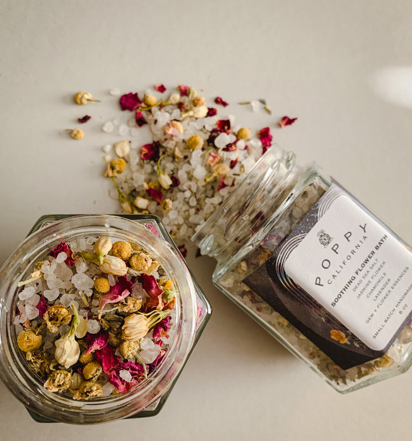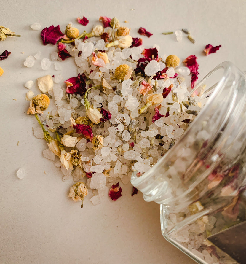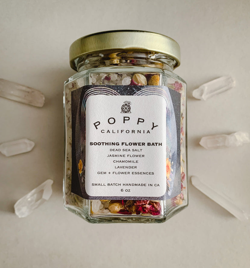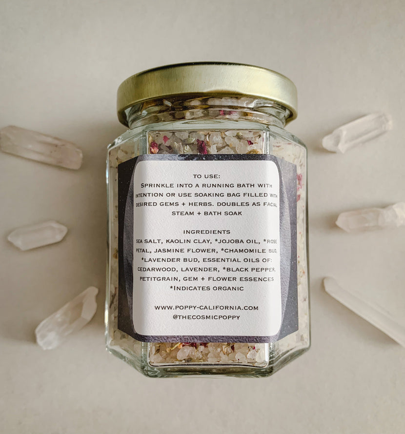Handmade in Grass Valley, CaliforniaS O O T H I N G + C A L M Self-love and care are where it all begins. This flower bath salt blend was created with so much love, joy, music and intention all along the way and is to promote self-love and care for the moments we may need it most. Immerse your body, soul, and senses with a dried flower and salt blend to sprinkle into a running bath during celestial, bathing, and meditation rituals. Shower and cleanse body prior to soaking in a hot bath for a completely relaxing and grounded experience. This package is a 6oz glass hex jar I N G R E D I E N T S Made with Dead Sea Salt, Kaolin Clay, *Jojoba Oil, *Rose Petal, *Chamomile, Jasmine Flower, *Lavender and Essential Oils of Cedarwood, *Black Pepper, Lavender, Petitgrain, Gem + Flower Essences (*indicates organic) P R O P E R T I E S Therapeutic: Improves Circulation, Calms the Spirits, Anti-inflammatory Magickal: Magickal: Love, Protection, Healing, Love Divination **These statements have not been evaluated by the FDA**
