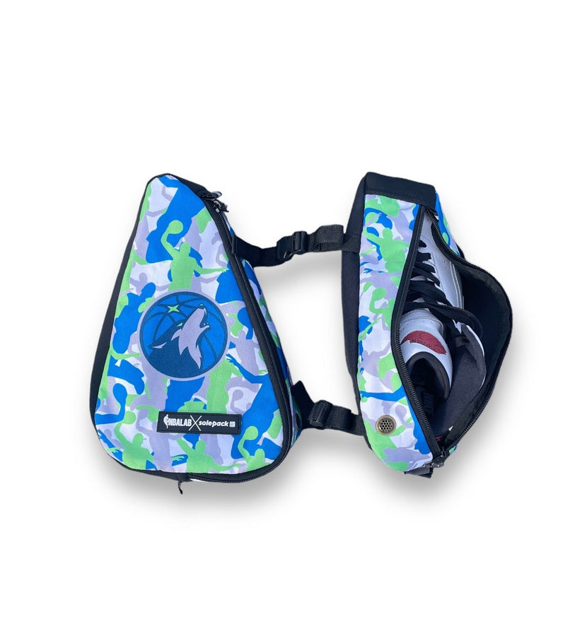 Minnesota Timberwolves. NBALAB x SOLEPACK SP-1. Pack the Twolves as they make their run for the top of the Western Conference! This special edition Minnesota Timberwolves NBALAB x SOLEPACK SP-1 shoe carrier takes packing kicks to the next level- repping your favorite team like never before! A collaborative player camo piece with the NBALAB and contemporary street artist, Billi Kid, graces the cover of our bags. Pack sneakers onto any backpack or our OMEGA pack and rep your team every time you hit the gym, courts or fly around the world. This collaboration celebrates the original concepts and cultures that has inspired the Solepack journey. Read more about the collab HERE !!! Available in L & XL ONLY [The SP-1 is an innovative backpack accessory for storing your kicks during travel. The dual compartments are made of a heavy duty ballistic poly blend and each have a neoprene sole that allows the bag expand to hold larger shoe sizes. The front and back adjustable straps allow you to wrap the bag around most backpacks. Each compartment has a strategically placed vent to provide ventilation and keep your shoes fresh.] (*sizing NOTE. If you are a borderline size and wear shoes with wider soles, please size up to the next available.)